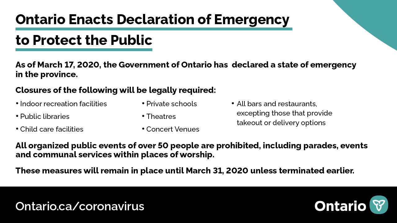 Effective immediately, the province has ordered the closure of all facilities providing indoor recreation programs, all public libraries, all private schools, all licensed childcare centres, all theatres, cinemas and concert venues, and all bars and restaurants except to provide takeout food and delivery.