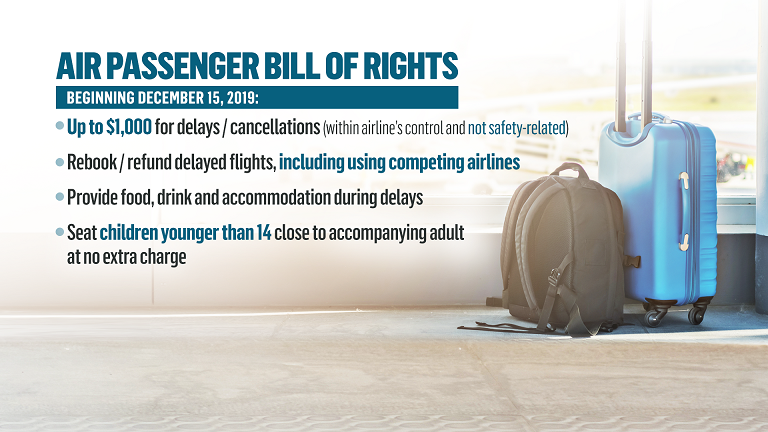 However, travellers will have to wait until mid-December for rules that will require airlines to seat parents beside or near their children at no extra cost, as well as compensation for cancellations