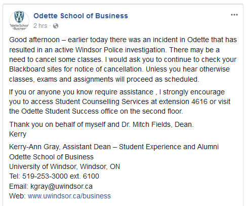 A post on the Odette School of Business Facebook page notifies students that "unless you hear otherwise, classes, exams and assignments will proceed as scheduled."