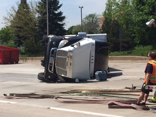 Transport truck on its side at the entrance to the Ambassador Bridge, May 17, 2018 (by AM800's Peter Langille)