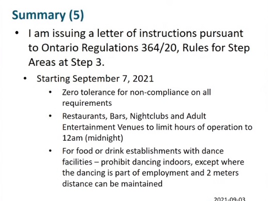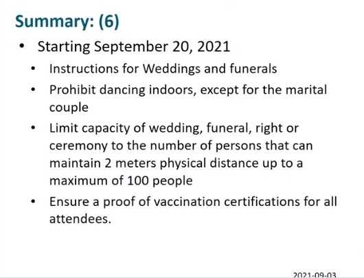 The health unit also announced as of September 20, indoor dancing is banned at all weddings, except for the marital couple.