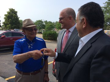 Performance Ford Windsor owner Terry Rafih hands over the keys to Earl Wilson. July 8, 2019 (Photo by AM800's Teresinha Medeiros)