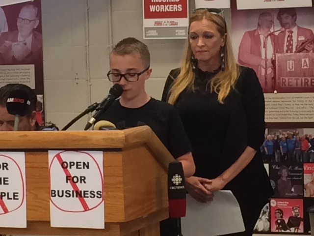 Grade 7 student Josh Goldthorpe and his mother Janice Hunter-Dejarlais at the Unifor Local 444 - 200 Hall in Windsor, June 7, 2019. (Photo by AM800's Peter Langille)