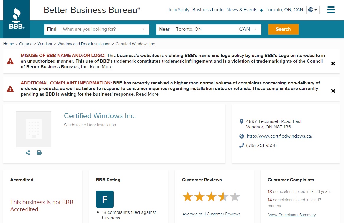 Better Business Bureau profile of Certified Windows, Noveber 1, 2018 (courtesy BBB)