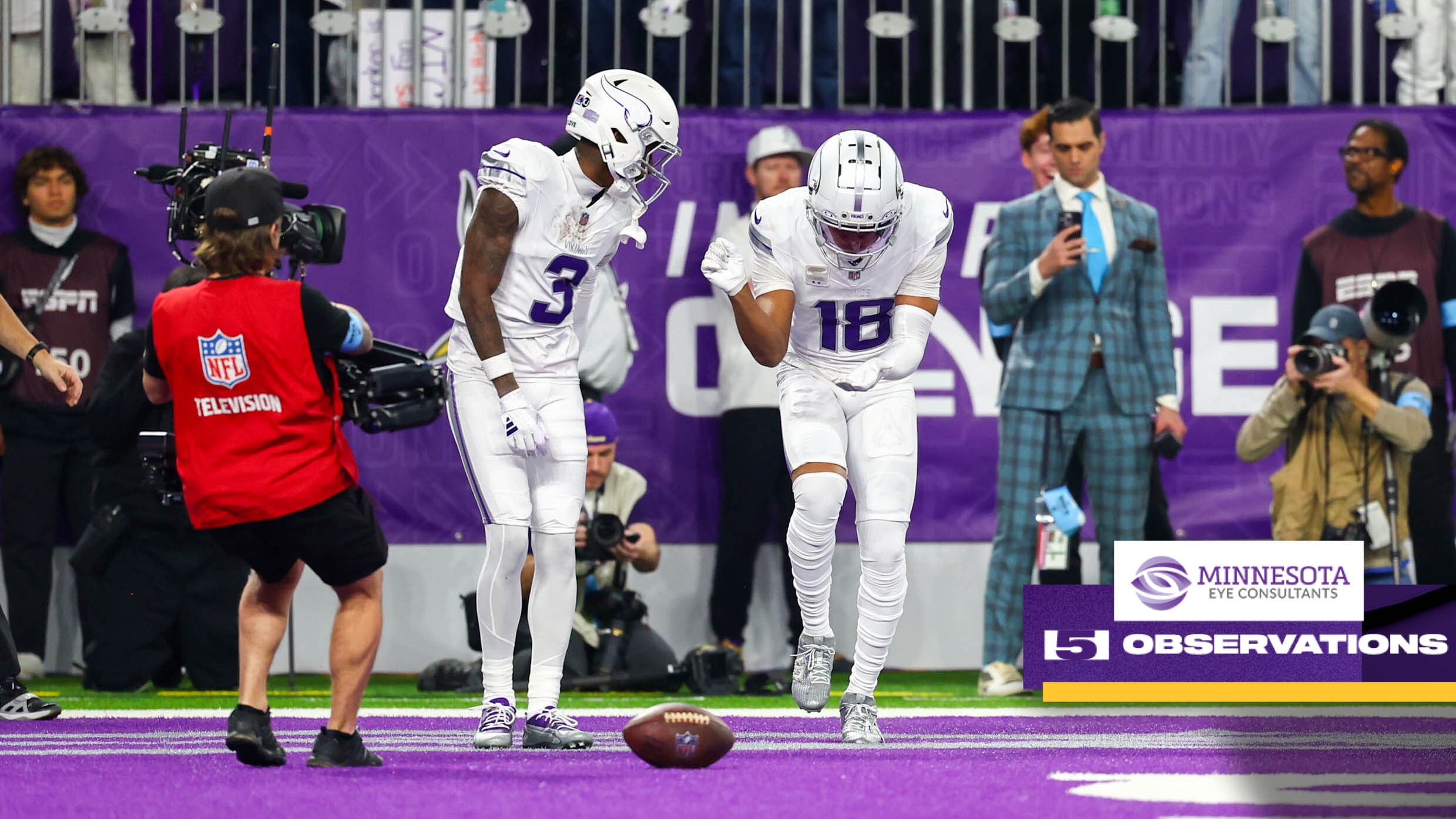 Wearing white helmets for the first time in franchise history to top the snow-like jerseys and pants in their now-annual winter-themed home game — comfortably staged indoors — the Vikings had an energized crowd behind them after former wide receivers Cris Carter and Jake Reed took a Randy Moss jersey to midfield for the coin flip in honor of their ex-teammate, who is being treated for cancer. Jefferson shouted, “We love you, Randy!” after his touchdown catch.