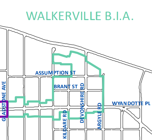 The Walkerville BIA district runs from Gladstone Avenue to Argyle Road, and from Riverside Drive East to Wyandotte Street.