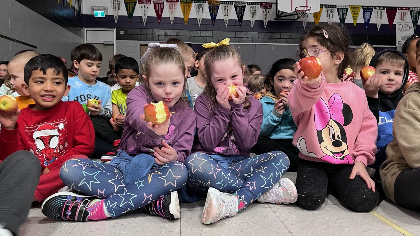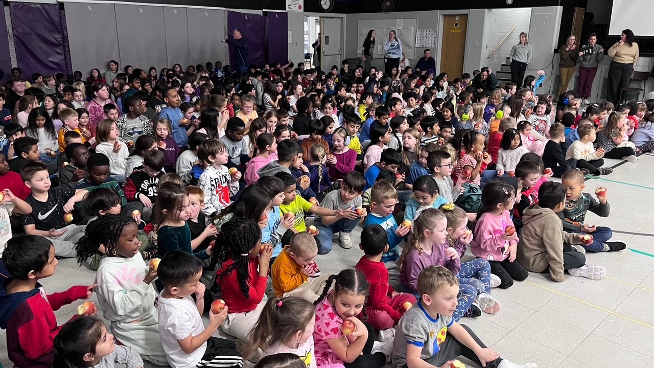 In schools across the region, the province, and the country on Thursday, students took part in The Great Big Crunch by taking a bite out of an apple to create a loud crunch at the designated time in order to call attention to its goal.