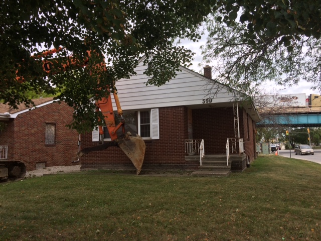 Excavator next to boarded up house beside the Ambassador Bridge (by AM800's Peter Langille)