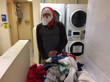 Dave Garvin, known as Canadian Dave on the streets, does his laundry at Street Health. July 17, 2019 (Photo by AM800's Teresinha Medeiros)