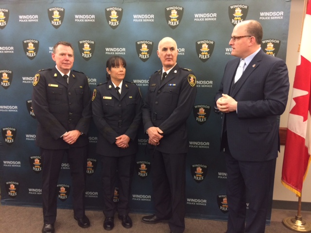 Windsor Police Services Board Chair and Mayor Drew Dilkens and Police Chief Al Frederick welcome Windsor's new deputy police chiefs. April 10, 2018 (Photo by AM800's Teresinha Medeiros)