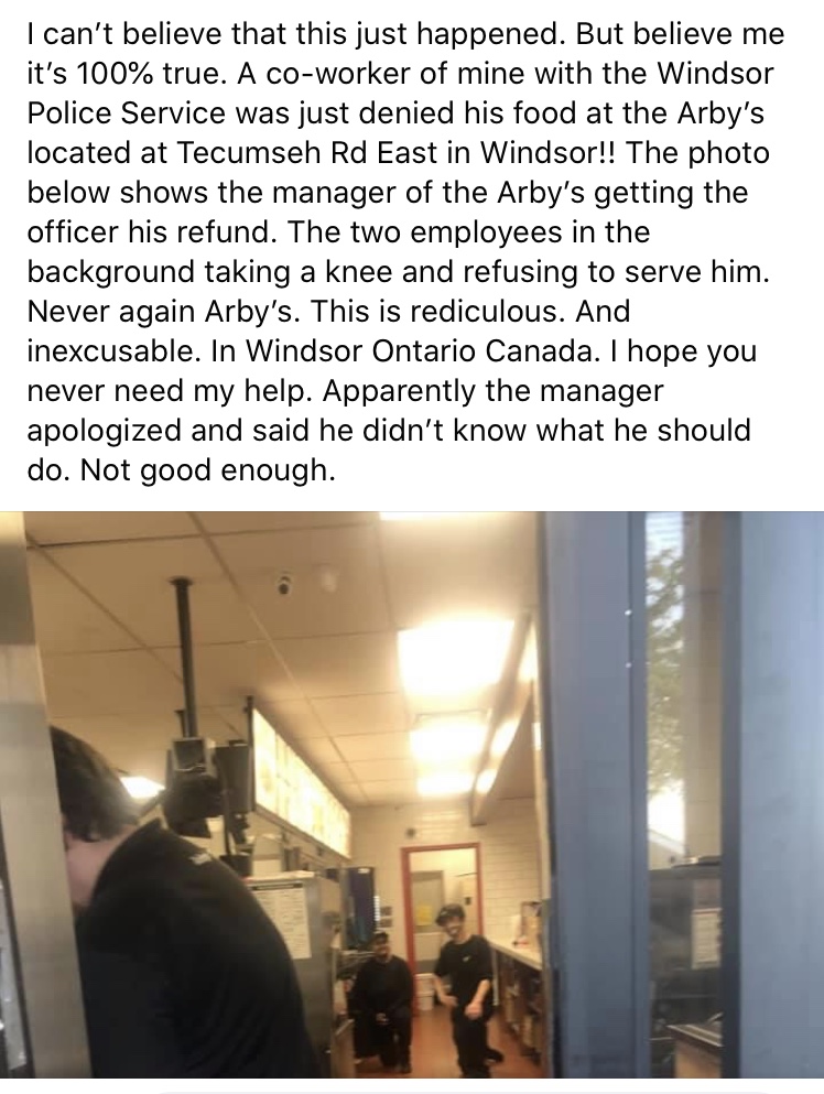 According to the post, that has since been taken down, the officer ordered food at the Arby's at 6807 Tecumseh Rd. E. Friday night.