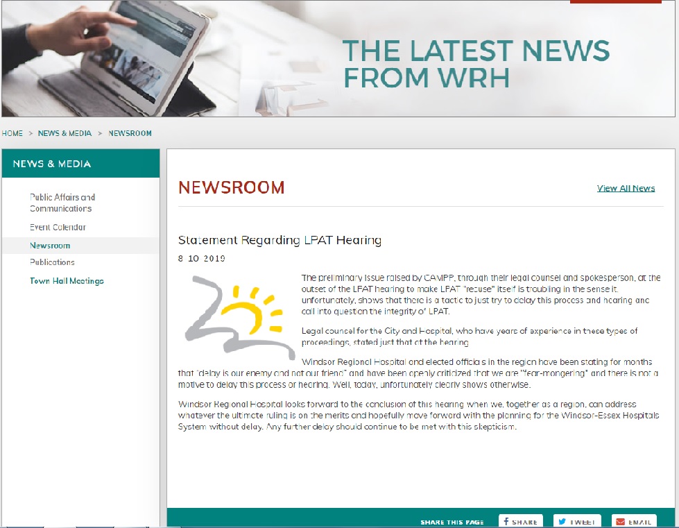 Screen shot of the statement issued by Windsor Regional Hospital on its website, October 8, 2019 (via WRH website)