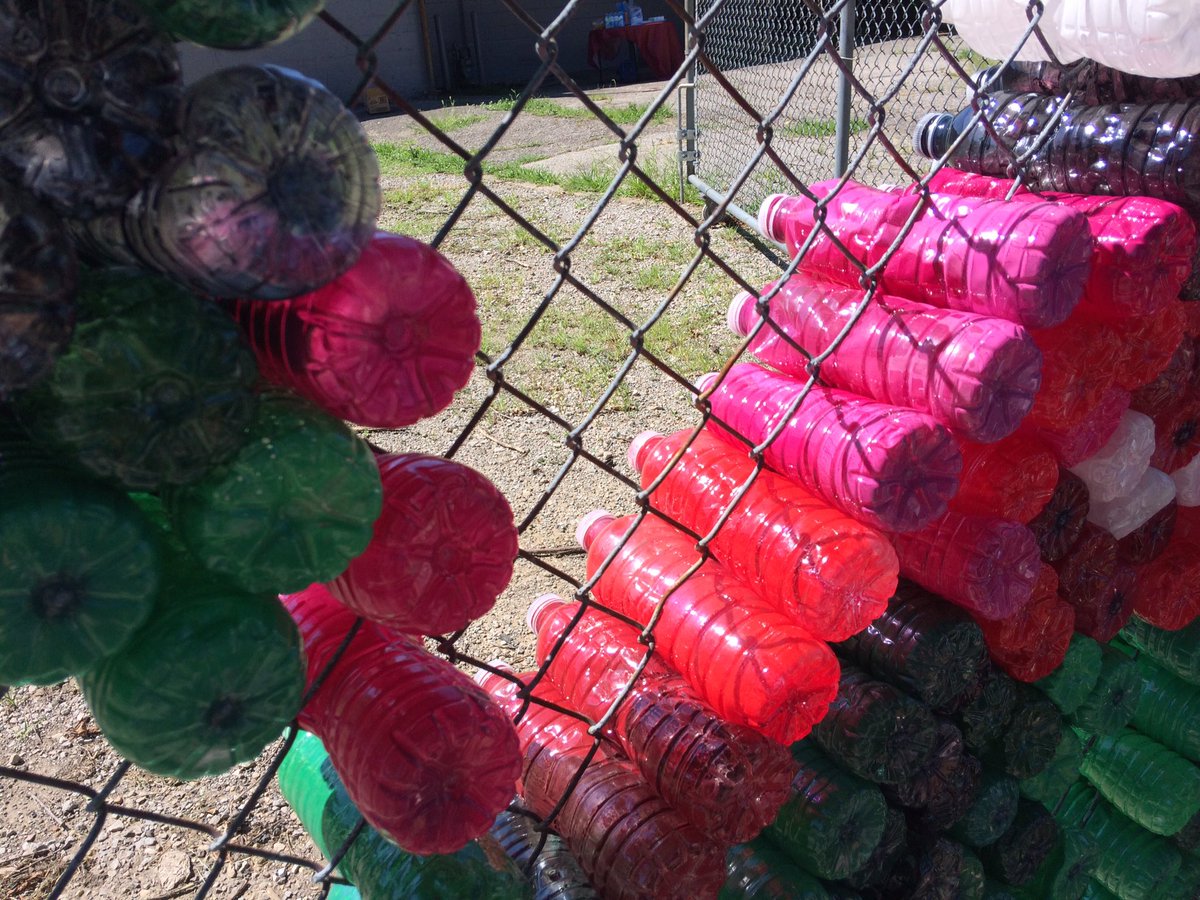 The chainlink fence behind the May Court Club was decorated by shoving spray painted water bottles into the links of the fence, placed in the image of a large pink rose.