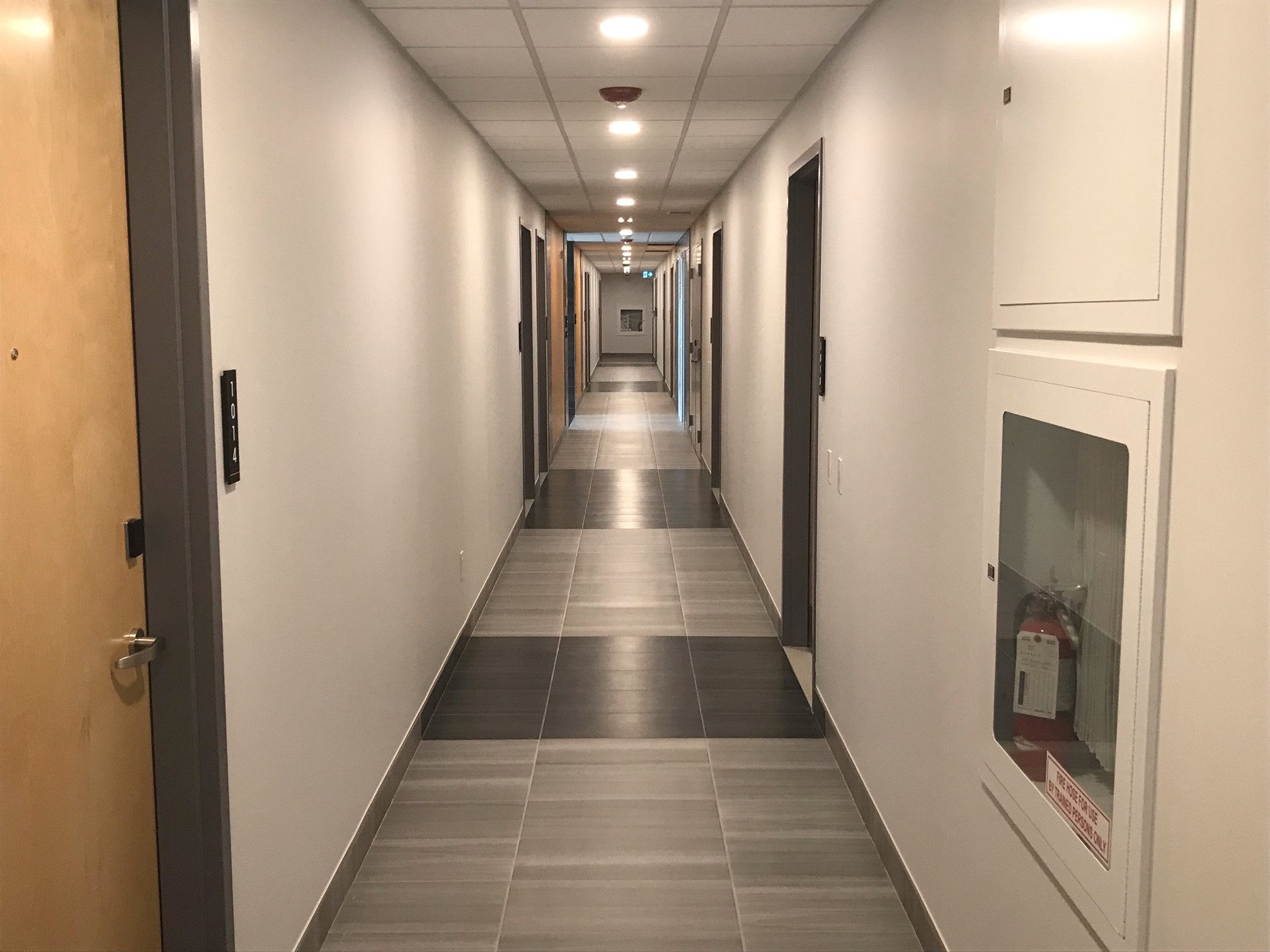 A hallway leading to apartment units at Meadowbrook Place, located off Lauzon Parkway at 3100 Meadowbrook Lane. (Photo: Rob Hindi)