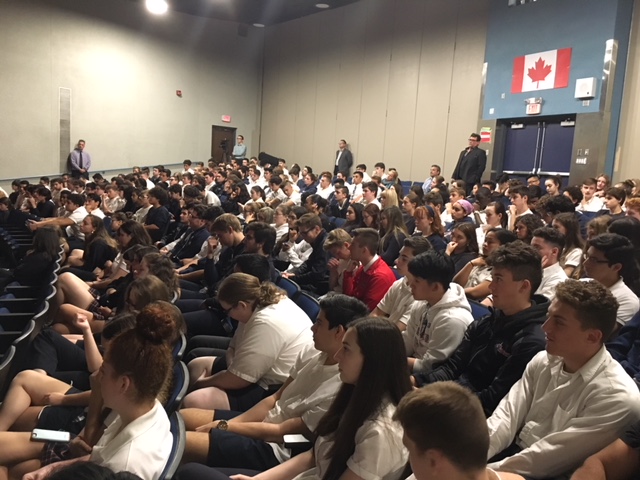 Grade 10 and 12 civics students from Holy Names Catholic High School hear from the four Windsor-West candidates, May 14, 2018 (Photo by AM800's Rob Hindi)