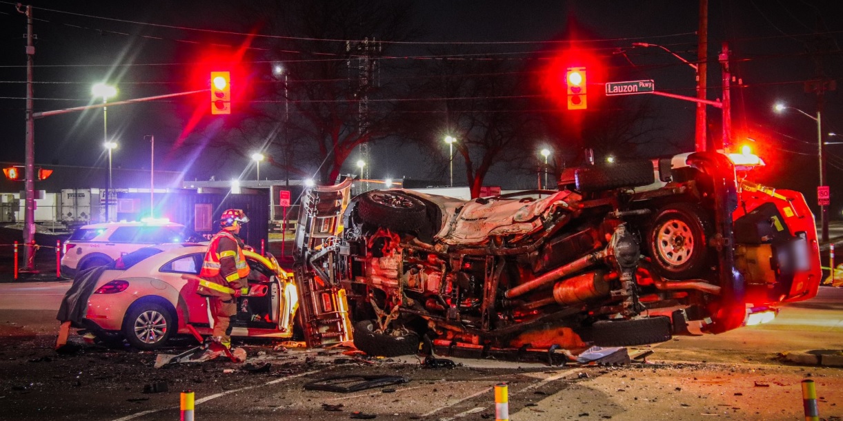 Windsor police say officers were called to the intersection of Lauzon Parkway and Hawthorne Drive just before 10 Tuesday night and found a white sedan with significant front-end damage and a white pickup truck flipped on its side.