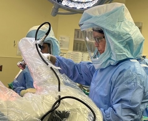 Dr. Mike McCaffrey performing a hip replacement surgery with the assistance of Stryker Mako SmartRobotics, a specialized robot used to perform joint replacement surgery. (Photo courtesy of Windsor Regional Hospital)
